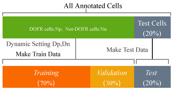 We use different parameter combinations to generate data sets as the input of the DCNN network for experiments. The number of labeled cells is small, thus, we use a five-fold cross-validation method to evaluate the results of different parameter combinations. We separated our total annotation cells almost equally into five segments. cells are used in the training of DCNN while the remainder () cells are used to validate the performance of our proposed method. For the training cells, we dynamically adjust the number of generated samples according to the ratio of the two types of cells to ensure a balanced sample ratio, that is, . Figure 6 shows the apportioning of the annotation cells for training and testing. For the test cells, each cell generates five PIMs, and the final result is judged based on the five results.