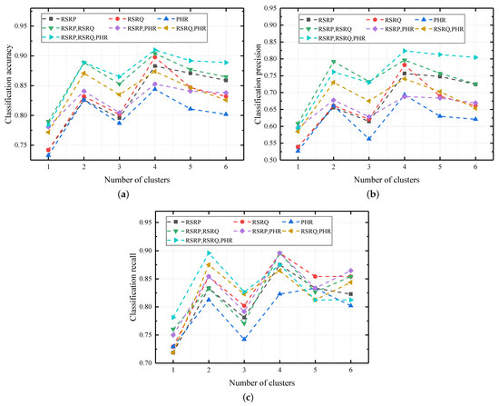 As Figure 8 shows, when the number of clusters is set to 4, the RSRP-RSRQ-PHR has the best precision and accuracy among all feature combinations. The relevant experimental results are recorded in Table 2. So, we choose RSRP-RSRQ-PHR and set the number of clusters to 4.