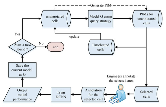 To reduce the high cost of cell annotation, we use active learning to preferentially select unannotated cells with a higher value for annotation to avoid the bias and randomness of randomly selecting cells. First, we determine the cells to be annotated from the unannotated cell set according to the select query strategy. Then the maintenance engineer conducts field detection and returns the annotation result. We generate samples of the newly annotated cells and add them to the training data set. Finally, the model is retrained on the updated data set. As the size of the training set continues to increase, the performance of the model continues to improve through the iterative annotation process. The iterative process of active learning is shown in Figure 10.
