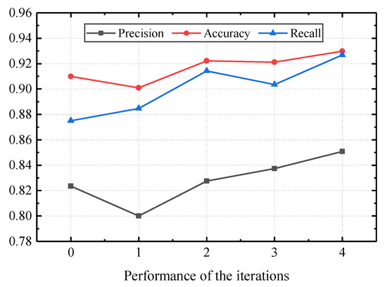 As shown in Figure 12, as the iterative process progresses, the performance of the model is significantly improved. Although these three broken lines in the figure have slight fluctuations, they eventually show an upward trend. After the fourth round of iteration, the accuracy, precision, and recall of the model reached 93%, 85%, and 93%, respectively, which met the initial expectations of mobile network operators. After the expansion of the annotated cells, the performance of the model has been improved. However, the total amount of data is still not large enough, and further improvement of the model performance requires more cell annotation.