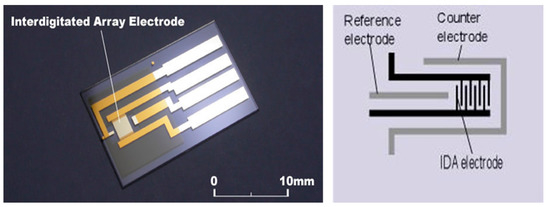 The sensor used in this study has already been described in a previous paper by our group [20]. It utilizes a platinum interdigitated array electrode coated by a titanium oxide layer whose thickness was carefully controlled. The coating layer was deposited by spraying the electrode with a solution of 10 mg/mL of commercial P-25 powder (Evonik, Essen, Germany) containing 5 nm titanium oxide particles. After drying and calcination at 600 °C for one hour, we obtained our final coated interdigitated array electrode (CoIDAE). Figure 1 below shows the array electrode before applying the coating.