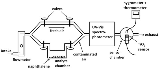 A diagram of the overall experimental apparatus is shown in Figure 2. A vacuum pump (not shown) at the tubing output or exhaust created an air flow that passed through the whole apparatus. The air flow was controlled by the pump and measured by a rotameter-type flowmeter (Cole Parmer, Vernon Hill, IL, USA). Two lines of air passage were available, one line for clean or fresh air and another line for air going to a chamber containing the naphthalene analyte and becoming contaminated with naphthalene vapor. The naphthalene in the chamber was in the form of solid flakes that sublimated to naphthalene vapor which then was mixed with the air flowing through the chamber. Tubing for clean air was made of standard PFA plastic tubing. Tubing leaving the analyte chamber all the way to the sensor chamber was made of PTFE Teflon tubing to avoid naphthalene adhesion or wall permeation. We used an analyte chamber made of quartz to place the naphthalene flakes, although a regular glass chamber could have also been adequate. Either clean or naphthalene-contaminated air was made to pass through a 10 cm-long quartz chamber inside a spectrophotometer to measure naphthalene vapor concentration. Absorbance measurements were made at a wavelength of 265 nm corresponding to one of the peaks of the naphthalene absorption spectrum having its corresponding reported absorptivity value [25]. Measured absorbance values were easily converted to concentration values by simply using Beer’s law and the absorptivity of naphthalene. The spectrophotometer used was the Shimadzu UV-2450 UV-Vis spectrophotometer made by Shimadzu Corporation (with USA headquarters in Columbia, MD, USA). The tubing coming out of the spectrophotometer connected to the sensor chamber, a sealed glass chamber containing our own-made TiO2-based sensor and two small commercially available sensors to measure air relative humidity and temperature inside the chamber.