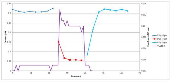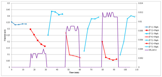 Typical sensor current response to one cycle of naphthalene contamination and cleaning. Micro-amp sensor current and absorbance measurements were made simultaneously. P1 corresponds to the initial fresh air introduction (baseline phase), P2 corresponds to naphthalene + air introduction (contamination phase), and P3 corresponds to the re-introduction of fresh air only (cleaning phase). The sensor current values can be read on the left-hand scale of the y-axis. The purple line (WL265.0) corresponds to the absorbance at 265 nm for naphthalene. Absorbance values can be read on the right-hand scale of the y-axis. An increase in absorbance corresponds to an increase in naphthalene concentration. Color lines with markers indicate sensor current measurements every 3 min. The purple line appears to be continuous because the spectrophotometer made absorbance measurements every minute. Sensor current decreased as naphthalene concentration increased.