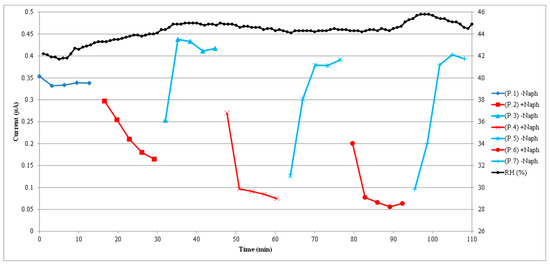 Three cycles of naphthalene contamination and cleaning with fresh air are presented in Figure 6. These three cycles were run independently and separately from the run of the single cycle shown in Figure 4. In regard to the graph of Figure 6, the lines’ color format is the same as in Figure 4. The initial darker blue line corresponds to the initial baseline current, the red lines correspond to the naphthalene contamination phases, and the light blue lines correspond to the cleaning phases with the passing of clean fresh air. The more continuous purple line corresponds to the absorbance measured by the spectrophotometer. The scale of the right vertical axis corresponds to the absorbance. For the cycles presented here, the naphthalene concentrations based on the absorbance measured by the spectrophotometer were 95 nM (10 ppm), 286 nM (31 ppm), and 381 nM (41 ppm) for the respective contamination phases of the three sequential cycles. As the naphthalene concentration was progressively increased, the sensor peak electrical current progressively dropped during the contamination phases of the sequential cycles from the initial current at baseline. The sensor current values recovered during the corresponding cleaning phases of the three cycles. For these cleaning phases, the sensor current ended up higher than the current at the original baseline because of an air relative humidity drift that is shown in the next figure. Using the sensor current value before the contamination phase of each cycle, the following sequence of current drops occur with the presence of naphthalene: the current dropped from 340 nA to 164 nA (176 nA drop) for the first cycle, from 417 nA to 75 nA (342 nA drop) for the second cycle, and 391 nA to 56 nA (335 nA drop) for the third cycle. Although the third cycle had a higher concentration of naphthalene in the contamination phase than the second cycle, the current drops of the two cycles were similar because the drift in relative humidity affected the current measurements. The relative humidity is not shown in this Figure 6, but in the next figure. Overall, however, the sensor current decreases with increased naphthalene concentration and, for all three cycles presented here, the sensor current recovers completely after the cleaning phase with fresh air.