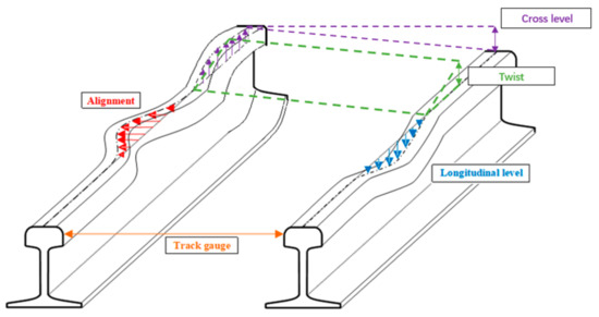 Keeping railway tracks in good operational condition is one of the most important tasks for railway owners [1]. However, the track quality is commonly determined by various complicated factors and thus cannot be accurately predicted by mechanical algorithms or empirical methods. Instead, the track quality has to be maintained actively based on regular track geometry inspection [2]. Track geometry is the geometry of track layouts, indicating the dimensions and relative positions of each part of the railway track [3]. It typically includes gauge, twist, longitudinal level, alignment, and cross-level (also named superelevation or cant), as shown in Figure 1. The definitions of the parameters are shown in Table 1. All parameters are regularly measured at a network level to ensure the values are within a safe range for train operation [4].