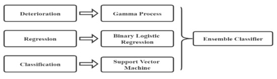 The prediction accuracy of the SVM model can be improved when combined with another algorithm. Gallo et al. [99] have proposed two ensemble classifiers (aggregation and stacking) to predict cross level, longitudinal level, and twist. The classifiers consider three perspectives: degradation, regression, and classification, modelled by the gamma process, binary logistic regression, and SVM separately, as shown in Figure 6. The results show that the accuracy of the ensemble methods for predicting longitudinal level and twist is higher than that of the single SVM model, while it is lower for predicting cross level, wherein the detailed improvements are shown in Table 8.