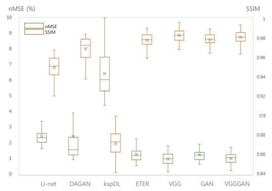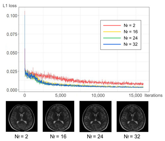 Various loss functions were analyzed, where the adversarial loss and the perceptual loss were added to the ETER-net, while the pixel-wise loss function with a weighting factor () of 1 was utilized as a baseline. For the perceptual loss, the feature-level difference was used as a loss based on the pre-trained VGG network. The loss functions utilizing either adversarial loss, perceptual loss, or both were compared to evaluate the effectiveness of the loss functions. Other parameters are described as follows. For Cartesian MRI, for adversarial loss was also set as 1 when only the adversarial loss was additionally used in combination with the baseline loss function. If only the perceptual loss was added to the baseline loss function, = 50 was used for perceptual loss. When both adversarial loss and perceptual loss were additionally used, = 0.02 and = 5 were used for adversarial loss and perceptual loss, respectively. Then, the total number of parameters of the ETER-net utilizing the DFU for the refinement network is 312,367,393. For radial MRI, = 0.001 was used for adversarial loss where the adversarial loss was additionally used in combination with the baseline loss function. When only the perceptual loss was added to the baseline loss function, = 0.01 was used for perceptual loss. When both adversarial loss and perceptual loss were additionally used, = 0.001 and = 1 were used for adversarial loss and perceptual loss, respectively. Then, the total number of parameters of the ETER-net was 453,460,769. The training was commonly performed as in Adam [35] with lr = 0.0001.
