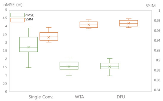 Figure 4 presents the reconstructed images from three different refinement networks: the single convolution layer, multiple convolutional layers, and dual frame U-net. Figure 5 presents the quantitative analysis of the three refinement networks. As shown in Figure 4, the images refined by the single convolution layer contain a substantial amount of structural artifacts. In addition, the image details are also deteriorated. In contrast, the images refined by the WTA and DFU have considerably improved image quality, and the image details are clear. However, the images refined by the DFU have better image details. The quantitative measures also demonstrate that the DFU can be efficiently used for the refinement of the latent features in the proposed method. The single convolutional layer shows considerably higher nMSE and lower SSIM values than the other two methods, and the DFU shows improved performance in terms of nMSE and SSIM.