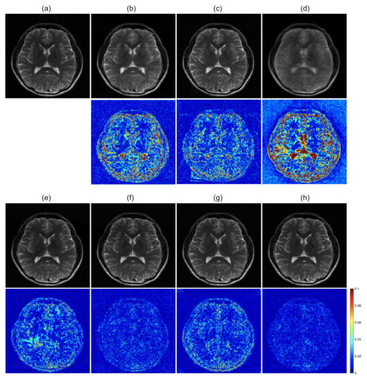 To further optimize the proposed network for image reconstruction, two different losses were additionally calculated along with the baseline loss function of the Euclidean distance: adversarial loss and perceptual loss. The effects of the loss functions were analyzed for the undersampled k-space data with R = 4. The ETER-net with different loss functions was also compared with two different image-domain to image-domain reconstruction methods, DFU [27] and DAGAN [19], and a k-domain to k-domain reconstruction method, k-space deep learning for accelerated MRI [16]. Figure 7 shows the result images and errors, and Figure 8 shows the quantitative analysis of the reconstructed images. Figure 7b,c show a substantial amount of image artifacts and aliasing patterns, owing to the regular subsampling of the input k-space data. In contrast, the proposed methods show quality results, and the aliasing artifacts are eliminated in these images (columns (e–h)). By comparing the images reconstructed with various loss functions, it can be concluded that the loss functions, including the Euclidean distance, adversarial loss, and perceptual loss, provided the best performance in terms of image quality.