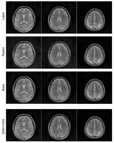 Comparison of inverse Radon transform with the proposed method with/without additional losses. Four example images reconstructed from radial k-space data with 100 view angles are shown. Label: reconstructed images from radial k-space data with 400 view angles by inverse Radon transform, Radon: inverse Radon transform, Base: the proposed method with the baseline loss function, GAN + VGG: the proposed method with additional adversarial and perceptual losses.