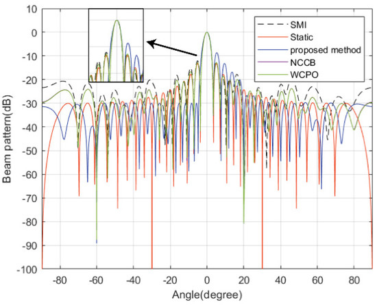 3.2. The Proposed Beampattern versus SMI and Static Beamformers