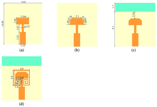 Figure 2d, for mutual field cancelation. In the following sections, two single-element antennas are placed on common substrates to realize two-element MIMO antennas. The detailed analysis is presented in