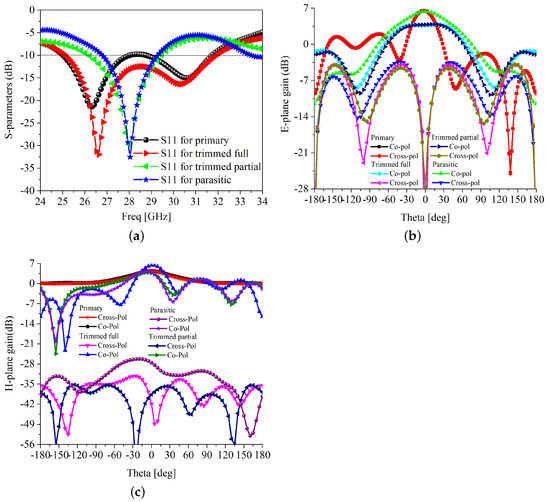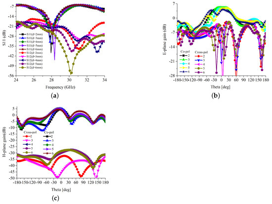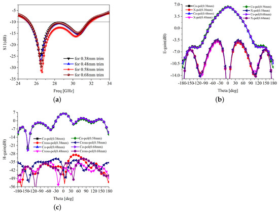 Figure 4b,c. However, the co- and cross-polarization isolation is more than 30 dB in all cases; thus, the effect of trimming level can be ignored. The scattering parameters against the different length of the parasitic element are shown in