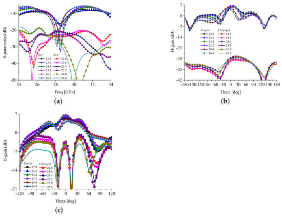 Figure 3a. Meanwhile, the single element with the truncated ground and parasitic loaded designs has a narrower bandwidth, covering from 26.7 to 29.2 and 26.2 to 29.5 GHz, respectively. In an ideal rectangular patch antenna, the radiation occurs only from the width of the patch, and the radiation from the length is null. However, in a practical antenna, some radiation occurs from the longitudinal side, which is stronger at the forward corners of the patch. Thus, by trimming these two corners, the cross-polarization level can be significantly reduced. The E-plane side-lobe level (SLL) is also improved by trimming the forward edges, as shown in
