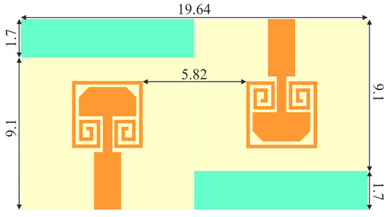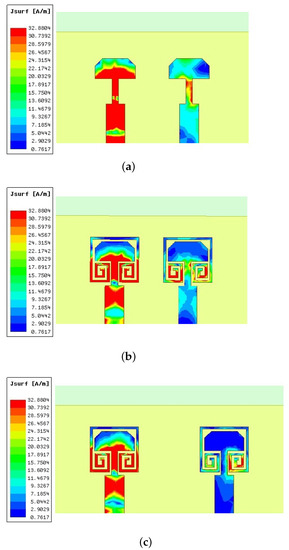 Figure 8a that the second element (right side) has strong mutual excitation. Strong surface current distribution can be observed on the feed line, as well as the trimmed radiator. This is due to the antenna elements being placed just 2 mm apart, lying within the near-field range at 28 GHz. When the spiral-inspired parasitic is loaded, the current distributions on the feed line and radiating patch have been significantly reduced. This confirms the success of the proposed field cancelation technique. These spiral-inspired parasitic are
