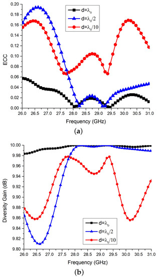 Figure 9a,b that the larger the separation between antenna elements, better the MIMO performance parameters. For the largest separation of