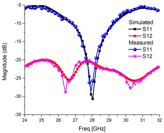 Figure 3. The primary design and the trimmed version antennas have a much wider bandwidth, covering from 25 to 31.6 GHz, as shown in