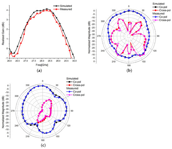 Figure 5b,c, respectively. Similarly, other design attributes of the proposed antenna are optimized to obtain the best possible impedance matching, bandwidth, gain, and co- and cross-polarization isolation.