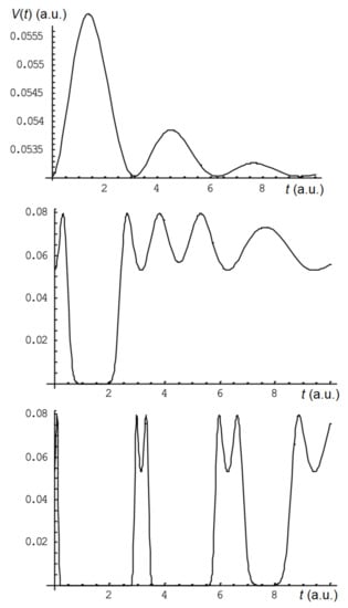 Expression (20) also allows you to analyze all the basic patterns similarly to the numerical calculation given above. As an example, in the Figure 1 shows the calculated output waveforms at nm, 0.047 nm, 1551.0 nm, 1550.9 nm, 1 a.u., 5 a.u. for conditionally small (), medium () and large () elongation. The specified parameters of the laser radiation spectrum and the reflection of the FBG are selected in order to obtain the most visual dependencies of the output signal.