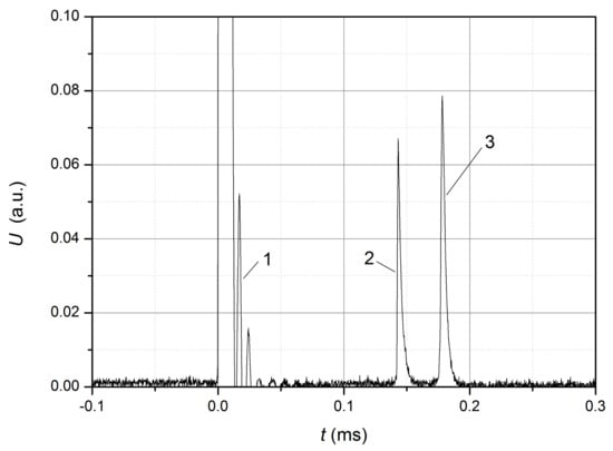 Waveform of the output signal: 1—induced interference caused by the current pulse; 2 and 3—pulses corresponding to the front and decay of the stretching wave.