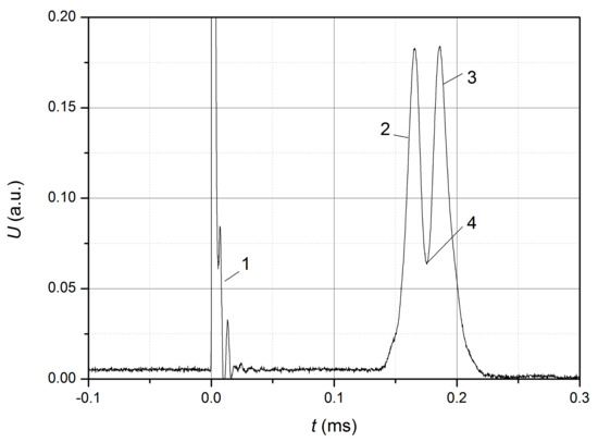 The waveform shown in Figure 4 was obtained in the absence of the initial tension of the optical fiber, and the fiber itself was partially bent. Since the pulse has two maxima, it can be concluded that the pulse front 2 and the decay 3 correspond to the front and decay of the stretching wave passing through the FBG, and point 4 corresponds to the transition from fiber stretching to compression, i.e., the rate of change at this point is 0. For this waveform, the delay between the front of the current pulse and pulse 2 (Figure 4) was 153 s between the maxima of pulses 2 and 3–21 s, and the pulse duration from the level at the front of the pulse 2 to the maximum of the pulse is approximately 5 s, which allows us to assume a significant increase in the dispersion of the pulse. Since the time required to achieve a fiber stretching value equal to the tension in the previous case considered is not known for sure, the estimation of the wave propagation velocity based on and can give a significant error. The estimated rate of increase in stretching at the pulse front is 16 /s for this case and should be regarded as an equivalent value (close to the average value) due to non-fulfillment of the condition .