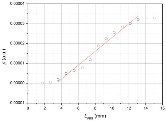 It follows from the data obtained that the dependence is nonlinear, but the linear approximation of can be used as the simplest approximation in the range from 3 mm to 13 mm. That is, the condition of additivity of the reflected radiation power from the length of the FBG is approximately fulfilled in the specified range of lengths of the FBG. In addition, as the simplest approximation, the half-width of the reflection spectrum of the FBG can be assumed to be a constant when the length of the FBG is more than 7 mm. The resonant wavelength of the reflection of the FBG with the change in the length of the FBG from 2.5 mm to 15 mm changed by no more than 0.05 nm, which is presumably caused by a change in the distribution of internal mechanical stresses and the bending radius of the FBG during its shortening. It can be assumed that all gratings manufactured using the technology described above have approximately the same parameters.