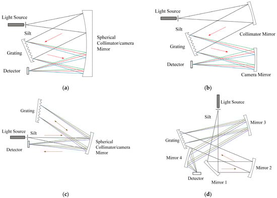 - Gil, M.A.; Simon, J.M.; Fantino, A.N. Czerny-Turner spectrograph with a wide spectral range. Appl. Opt. 1988, 27, 4069–4072. [Google Scholar] [CrossRef]