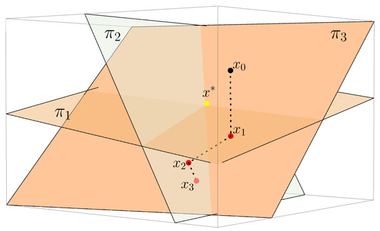 The ideas of analytical and algebraic algorithms arose long before the construction of the first computer tomograph. Thus, in 1937, Stefan Kaczmarz presented an iterative algorithm for solving a system of linear equations and proved its convergence [17] (assuming that a given square matrix system of linear equations has exactly one solution). This algorithm was rediscovered in the 1970s by Gordon, Bender and Herman as a useful tool for the problem of image reconstruction (after proving the convergence of Kaczmarz’s algorithm also in [15]). Figure 3 shows a graphic interpretation of Kaczmarz’s algorithm.