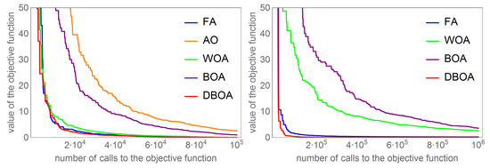 The left figure shows a comparison of the dependence of the objective function value on the number of iterations, while the right one shows the dependence of the objective function value on number of calls to the objective function. The results obtained with the DBOA algorithm are marked in red, and the results in blue are marked for the FA algorithm.