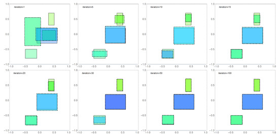 Now, we present a comparison of the obtained results for the two tested algorithms at this stage of the experiments. Figure 5 presents comparisons of the exact solution (areas bordered with a solid line) with the approximate solution (areas bordered with a dashed line) obtained with the FA algorithm for selected iterations. The height of the areas (they are cuboids) has been marked according to the color scale. The presented results show that the FA algorithm, after a relatively short number of iterations ( 20), “approaches” the exact solution, and obtaining a satisfactory result requires the performance of another 80 iterations.