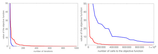 Comparison of the value of the objective function depending on the number of calls to the objective function for detecting one object (left figure) and detecting two objects (right figure).