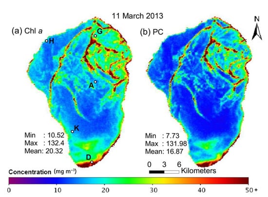 Distribution of (a) chlorophyll-a (Chl a) and (b) cyanobacteria-specific pigment phycocyanin (PC) in the surface water layer of Lake Kinneret on 11 March 2013 (calculated using data of the HICO sensor installed at the International Space Station, the image is reproduced from ref. []). We have added the location of Stations A, D, G, H and K on panel (a).