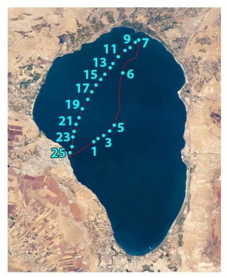 Map of Lake Kinneret with the track of the trimaran boat (red line) and spots where LiDAR sensing was carried out (cyan dots with ordinal numbers).