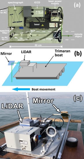 The fluorescence LiDAR used in our experiments [] is shown in Figure 3a. It is based on a compact diode-pumped pulsed solid state Nd:YLiF4 laser (Laser Compact, Ltd., model LCM-DTL-319QT: 527 nm, 5 ns, 10 Hz, 200 µJ/pulse). Two glass prisms are used to align the probing laser beam and the optical path of the receiving channel. Scattered light from a remote object was collected by a quartz lens (F = 21 cm) to the spectrograph entrance slit. The band-pass glass filters were used to suppress backscattered laser irradiation to prevent detector damage. The detection system consists of a compact spectrograph (Spectra Physics, MS127i) equipped with an ICCD (intensified charge coupled device) camera (Andor iStar). We used a low-resolution diffraction grating (300 lines/mm) and the entrance slit width of 250 µm to increase the signal-to-noise ratio. An aluminum-coated mirror was placed at the boat’s front side to direct the laser beam to the water surface (see the scheme in Figure 3b and the photo in Figure 3c).