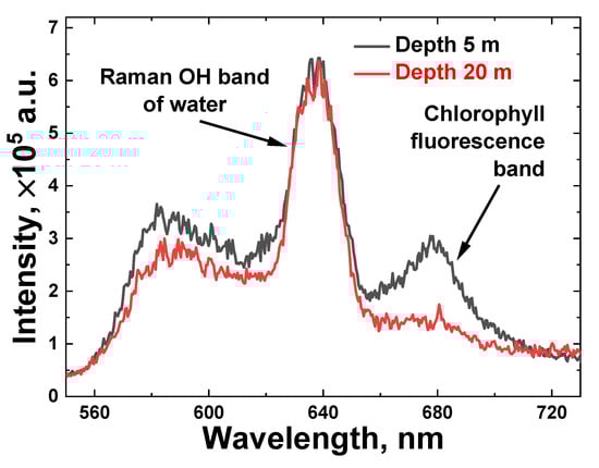First, we carried out LiDAR measurements of water samples taken from different depths near station A (see Figure 1a). Figure 4 illustrates raw LiDAR spectra of two water samples collected from a 5 m and 20 m depth with a Niskin bottle and measured onboard the trimaran. To increase the signal-to-noise ratio, each spectrum was acquired by summing 100 spectra that were detected from single laser pulses. In the spectral acquisition, the laser pulse duration was 10 ns with a 20 Hz repetition rate.