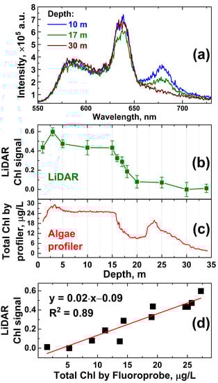 The in situ depth profiling of Chl a was carried out with the Fluoroprobe III profiler (bbe Moldaenke, GmbH) for Chl a at station A. Concurrently, water samples were collected with the Niskin bottle from different water depths, and then, the onboard measurements were conducted with the fluorescence LiDAR to compare the results. The obtained LiDAR spectra of water collected from 10, 17 and 30 m depths differ noticeably (Figure 5a).