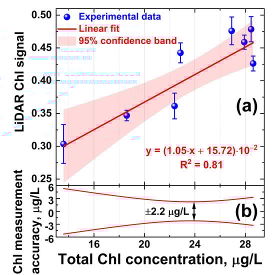 Owing to the correlation of the algae profiler and LiDAR measurement results, the LiDAR was calibrated for quantitative Chl a measurements. Typically, LiDAR data are calibrated by water samples taken at LiDAR measurement points and later analyzed in the laboratory using certified techniques []. However, the Chl a concentration can be altered during phytoplankton transportation to the laboratory over a few hours [], so systematic errors may be introduced into the LiDAR calibration. Here, we carried out in situ LiDAR instrument calibration on the total chlorophyll concentration. A series of 8 water samples was taken with the Niskin bottle from 1, 3, 5, 10, 14, 16, 17, and 18 m depths at Station A. These samples were immediately measured onboard the trimaran with the LiDAR. Reference values of the total chlorophyll-a concentration were acquired in situ during the Fluoroprobe vertical profiling performed concurrently with water sampling. Given the above-mentioned difference between the LiDAR and Fluoroprobe data at 20–27 m depths (Figure 5b,c, respectively), for proper LiDAR calibration, the data collected below the 20 m isobath were not used in the calibration to avoid the impact of the bacteriochlorophyll e on the total Chl readings by the Fluoroprobe profiler. Five parallel LiDAR measurements were carried out for each sample to calculate standard deviations. The dependence of the LiDAR chlorophyll-a signal versus Fluoroprobe measurements is presented in Figure 6. The LiDAR calibration curve was obtained by linear fitting, and 95% confidence band intervals were computed to evaluate measurement errors. Here, we define the accuracy of chlorophyll concentration measurements by LiDAR as the corresponding abscissa interval between the upper and lower confidence band curves at the selected ordinate value. The error of chlorophyll-a concentration measurements by the algae profiler was ±0.01 μg/L, according to the manufacturer’s specification []. The results suggest that chlorophyll concentration measurements by LiDAR were possible with accuracy of ±2.2 μg/L (Figure 6b).