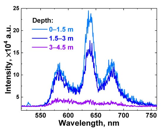 The acquired spectrum intensity fell as the depth increased, and for a 3–4.5 m depth layer, the signal bands had very low intensity due to a strong scattering of the laser radiation in turbid water; hence, no meaningful information could be obtained from it, and further, this layer will be excluded from consideration.