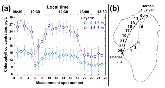 First, we studied the depth profiles of chlorophyll concentration at different points. Figure 8a illustrates the results of chlorophyll concentration depth profiling along the trimaran route from Tiberias city to the Jordan River mouth and back (see the route in Figure 8b). According to Figure 8a, the maximum chlorophyll concentration was observed at a depth of 1.5–3 m. The chlorophyll concentration was significantly lower in the upper water layer, which may be explained by phytoplankton diurnal vertical migration [,]. The comparison of different depth horizons indicates that chlorophyll concentration in the first and second layers (0–1.5 m and 1.5–3 m depth) changed symbatically along the sensing route. Several features can be outlined: (i)—chlorophyll concentration in the first layer was twice as low as in the second one, so the algae distribution over Lake Kinneret derived from satellite images may not be correct; (ii)—chlorophyll concentrations near Tiberias city and near the Jordan River mouth were twice as high as in the middle of the Lake; (iii)—chlorophyll concentrations in the first and second water layers varied symbatically.