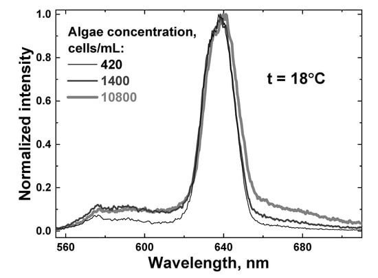The remarkable feature of the LiDAR instrument is its capability to measure water temperature, including depth profiling by quantifying Raman OH band profile distortion [,]. Water temperature is one of the important parameters in ecological surveys of water bodies. There are numerous techniques and instruments for the remote sensing of water temperature including LiDARs, and descriptions of these techniques can be found elsewhere [,]. However, in the majority of works, water temperature is studied in seas where the algal concentration is low compared to that of freshwater reservoirs, which makes LiDAR measurements of seawater temperature rather easy. Typically, the non-bloom algal concentration in a marine environment is <1000 cells/mL [], while in freshwater reservoirs, it may exceed 30 000 cells/mL []. Here, we conducted a systematical study of high algal concentration influence on LiDAR water temperature measurement accuracy. Recently, we have demonstrated that the laser remote sensing of temperature can reach 0.15 °C accuracy for distilled water []. The suggested “centroid” technique is very sensitive to small distortions of the Raman OH band envelope; however, we have not studied the impact of the Chl a fluorescence peak on the accuracy of temperature measurements.