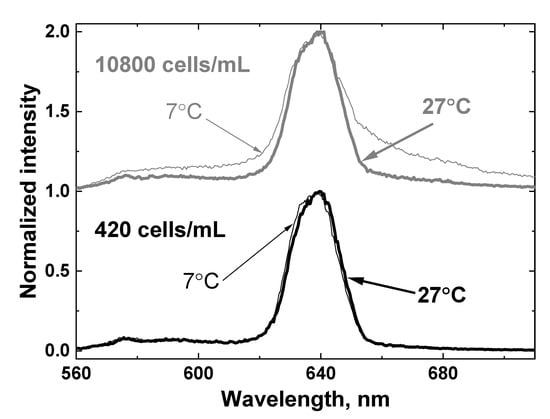 LiDAR spectra of two samples with minimal and maximal algae concentration: 420 cells/mL (lower panel) and 10800 cells/mL (upper panel) at low and high temperature (7 and 27 °C). The spectra are shifted vertically for better view.