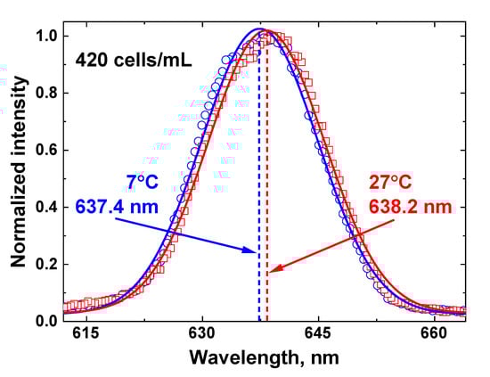 Figure 11 shows the LiDAR spectra of two samples with minimal and maximal algal concentrations (420 and 10,800 cells/mL, correspondingly) at low and high temperatures (7 and 27 °C). It can be seen that both the temperature and presence of algae distort the OH band contour.