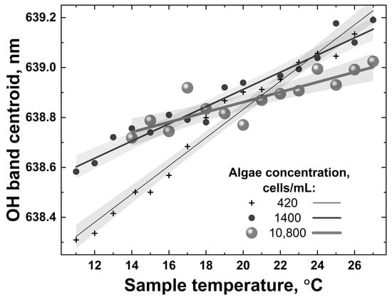 Examples of temperature dependencies of the OH band centroid for water samples with different algae concentrations (420, 1400 and 10,800 cells/mL) when heated from 10 °C to 27 °C. Symbols represent OH band centroids calculated from the experimental spectra; solid lines and shaded regions are corresponding linear fits and their confidence bands.