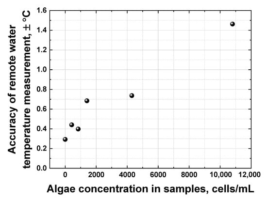 Dependence of the remote water temperature measurement accuracy on algae concentration in samples.