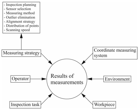 This article concerns coordinate measurements carried out by means of coordinate measuring machines cooperating with contact scanning measuring probes, which produce more accurate measurement data than CMMs with non-contact measuring probes [5]. The effectiveness of contact coordinate measurements depends on the accuracy of the measurements and the duration of a given measurement task. The accuracy of contact coordinate measurements is influenced by a number of factors, including for instance, the environmental conditions prevailing in a measurement laboratory where a coordinate measuring machine is located, the accuracy of the coordinate measuring system and the applied measurement strategy [11]. Depending on the type of a coordinate measuring system, a measurement strategy may include various elements. For example, in the case of a coordinate measuring machine equipped with a contact measuring probe, the elements of a measurement strategy may include the scanning speed, the number of measurement points and their distribution on the surface of a measured product, the probe radius correction method adopted for calculating corrected measurement points based on the indicated measurement points, the filtration parameters of the measurement results, the methods of calculating associated elements, the ways of mounting a measured product on a CMM and determining a coordinate system of the workpiece under investigation, the settings regarding the removal of outliers and the use of a rotary table [11,12,13]. An overview of the factors determining the final coordinate measurement results is presented in Figure 1, which also includes examples of the elements that are part of the coordinate measurement strategy. The measurement strategy is one of the factors that have the greatest influence on the contact coordinate measurement results [13]. Therefore, in order to carry out accurate and fast coordinate measurements on a selected product, it is necessary not only to select the right measuring system, but also to use a measurement strategy appropriately selected for the given measurement task [14].