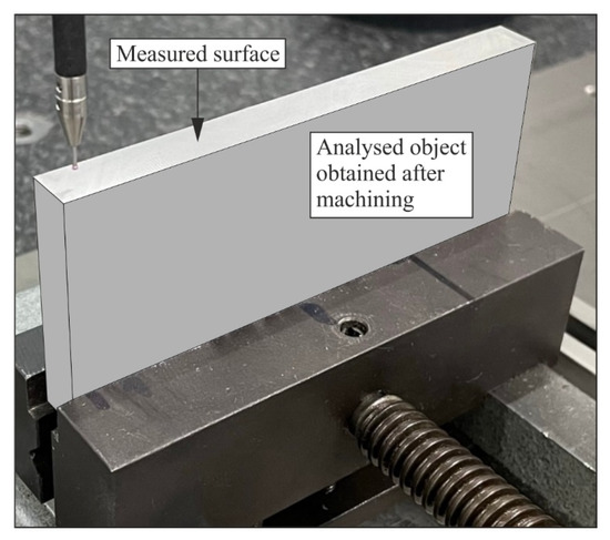 A model to calculate the contact coordinate measurement time required to determine the flatness deviation of a selected surface of a measured product was developed within the following work. A series of coordinate measurements of a sample obtained as a result of machining conducted by milling were made in order to develop the model (Figure 2). The machining was performed using a DMU 100 monoBLOCK multi-axis machine tool. The experimental research was conducted in accordance with the adopted research plan.
