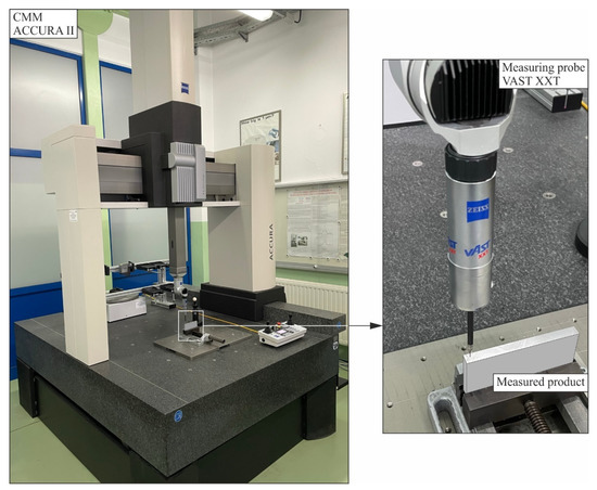 The coordinate measurements of the object under consideration were conducted using an ACCURA II coordinate measuring machine equipped with a VAST XXT contact scanning probe. The coordinate measuring system applied is presented in Figure 3. The coordinate measuring machine was characterised by the following accuracy parameters [12]: