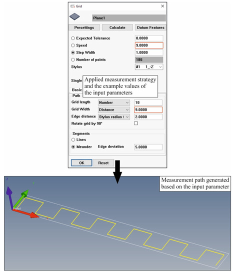 Measurements of the flatness deviation of the selected surface of the product were carried out using various measurement strategies, which were defined by modifying the scanning speed and the distance between measurement paths. The other measurement parameters, i.e., the distance between measurement points and the distance of the measurement points from the boundaries of the measured surface, were not modified; these values were the same for all measurement strategies under consideration. Therefore, they had no influence on the differences between the measurement results that were obtained with the analysed measurement strategies. The sampling step applied was equal to 1.0 mm, and the distance of points from the surface boundaries was equal to 2.0 mm. The value of the sampling step, i.e., the distance between the measurement points measured in the scanning mode, was based on the values compliant with the recommendations of the manufacturer of the applied coordinate measuring system, i.e., the Carl Zeiss company. These recommendations were published in [38]. The final number of measurement points located on the surface of the measured product for the assumed measurement path of the measuring probe, based on which the flatness deviation was calculated, resulted from the distance between the measurement paths and the sampling step. Figure 4 shows an example of the measurement strategy applied during the experimental research.