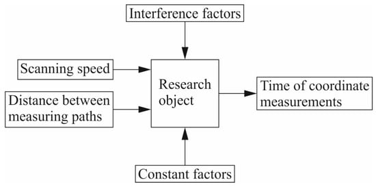 The model to calculate the coordinate measurement time was developed, as mentioned before, using RSM. The input factors were the scanning speed and the distance between the measurement paths along which the scanning process of the measured surface of the product was carried out. The output factor was the coordinate measurement time. The constant factors were, among others, the sampling step, the distance of the measurement path of the probe from the boundaries of the measured surface, the selected measuring probe stylus and the calculation method for an associated element. The interference factors were, for example, the vibrations and environmental conditions prevailing in the measurement laboratory where the ACCURA II coordinate measuring machine was located (Figure 5).