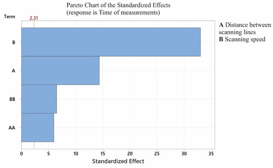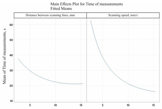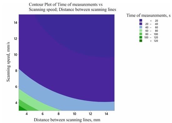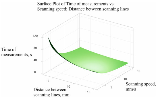 Figure 9 shows the influence of the two analysed input factors (i.e., the distance between the measurement paths and the scanning speed of the measuring probe) on the output factor (i.e., the time needed to take contact measurements to determine the flatness deviation of the selected measured surface). The coordinate measurement time for the measurement characteristic under consideration decreased with an increase in both the distance between the measurement paths (up to approximately 14 mm) and the value of the measurement velocity. Increasing the distance between measurement paths generates a smaller number of measurement points distributed on the measured surface of the product.